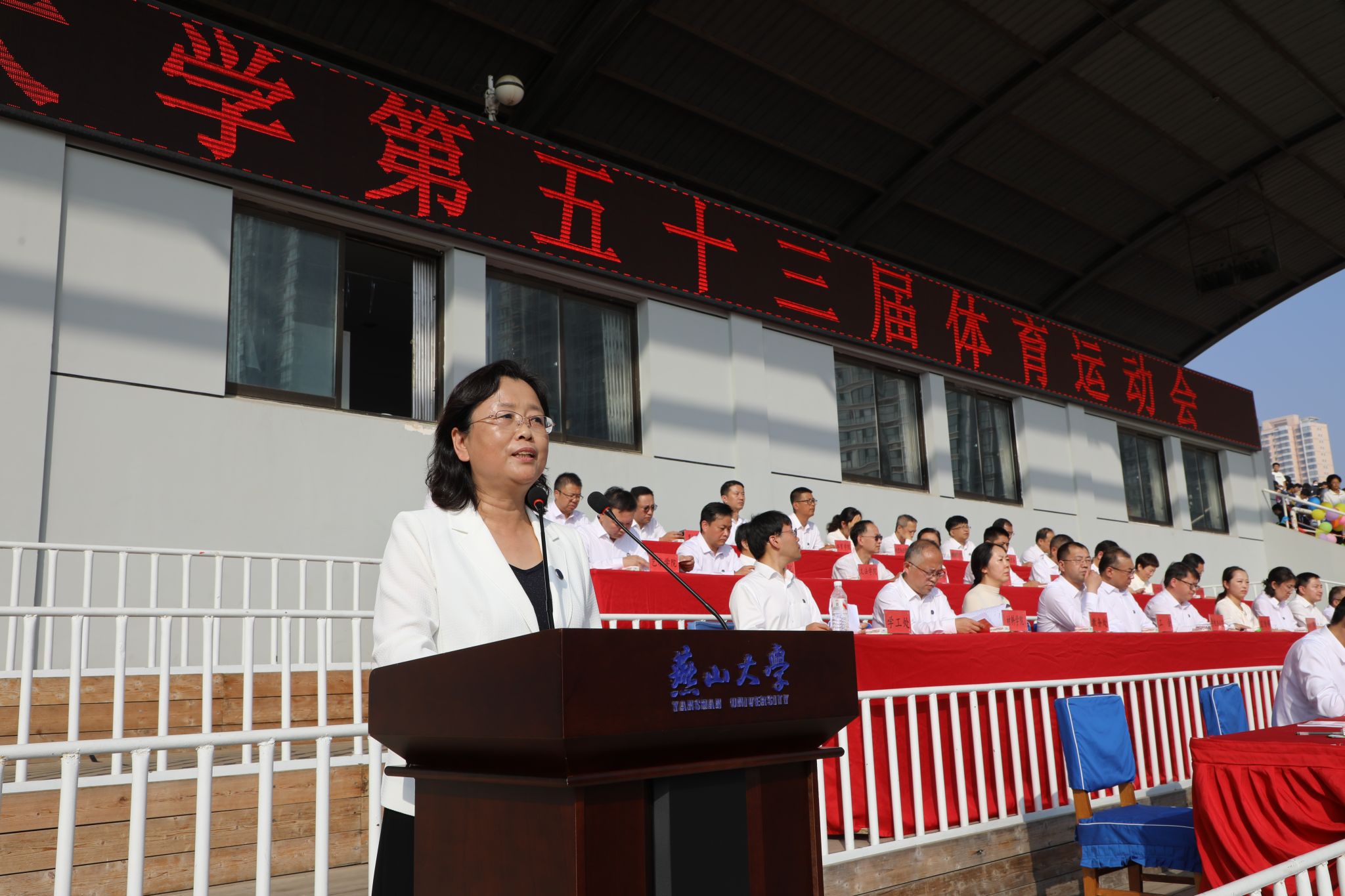 副校长李春玲致开幕词,她表示,从国家体育发展的宏大蓝图,到校园的体育实践,我们始终紧跟步伐、笃行实干。过去一年,学校以《燕山大学新时代体育工作方案》为纲领,绘就了体育育人的新图景:“课内外一体化”打破课堂边界,“一院一品”打造专属体育品牌,“早训晚练”让健康理念深入人心;研究生公共体育课程从无到有、从有到优,500余人次选课热潮,坚定了我们研究生体育课全覆盖的育人承诺。体育的魅力,在于超越自我,也在于汗水浇灌出的荣光。在过去的一年,燕大学子在健美操、花样跳绳、射箭、散打等各类大学生竞赛项目中,斩获国家级竞赛奖项25项,其中冠军奖项9项,亚军奖项8项,季军奖项8项;在河北省大运会摘得男子丙组铁饼冠军、5个项目挺进前八,以上成绩充分展现了学校体育育人的丰硕成果。她表示,本届运动会,既是对我校体育工作的全面检阅,更是激励全体师生以运动之名,铸奋斗之魂的动员令。希望运动员们以拼搏诠释燕大精神,赛出风采与实力;裁判员们以公正守护赛场尊严,执裁严谨高效;师生们以热情传递运动力量,共享竞技乐趣。